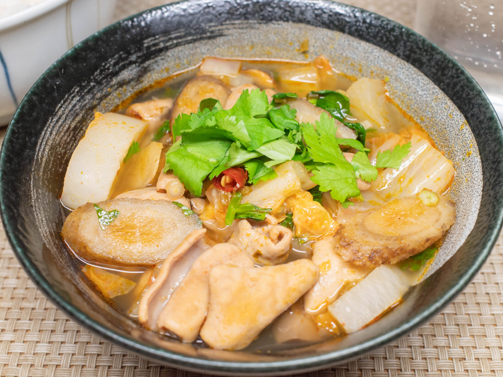ニンジン、キャベツ、小松菜、ニラと加えていく。葉野菜の量が半端ではなく、鍋も振れないくらいだったが、お玉で上下を返して火を通していく。味付けは、餃子に付いていたタレ、醤油、ラー油である。