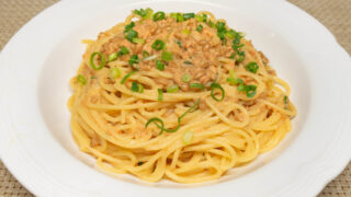 茹で時間9分のフィットチーネを7分で引き上げてフライパンへ。ソースとよく和えて出来上がり。
