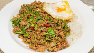茄子をしっかり炒めてから、覇入り卵かけご飯をフライパンに合わせて炒めていきます。ご飯がパラパラになったら最後に細ねぎを加えます。