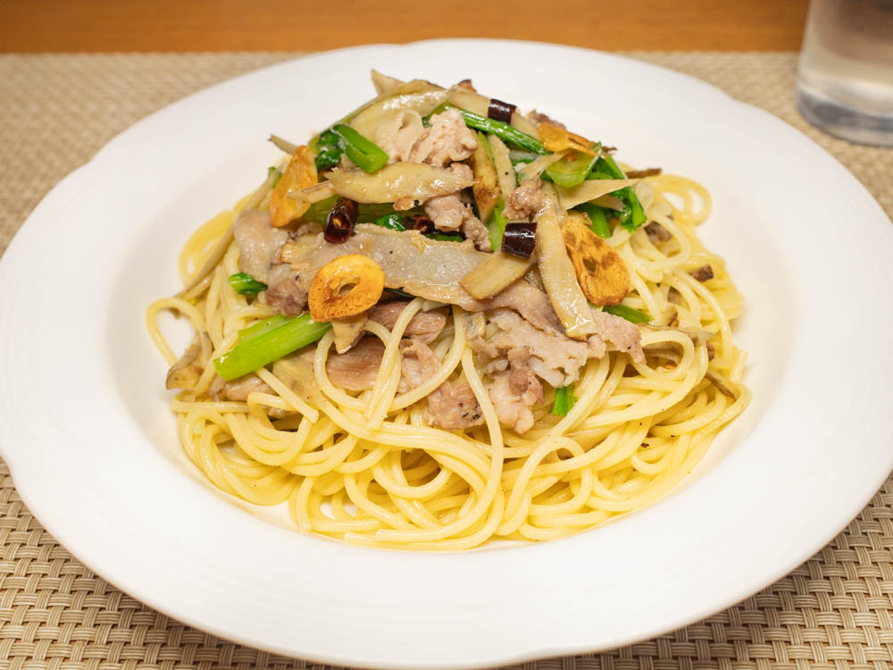 アンチョビとニンニクのソースに茹でたパスタを加えて合わせ、最後に炒めたパン粉を加えています。使う食材も、調理法も、できあがりの見た目も、至ってシンプルです。レストランで供されるものではなく、究極の自炊飯のようです。