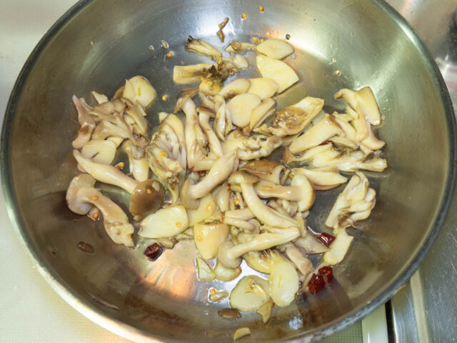 ニンニクの香りが立ったらきのこを加えて、しんなりしてくるまで炒めます。