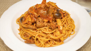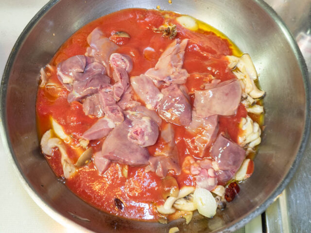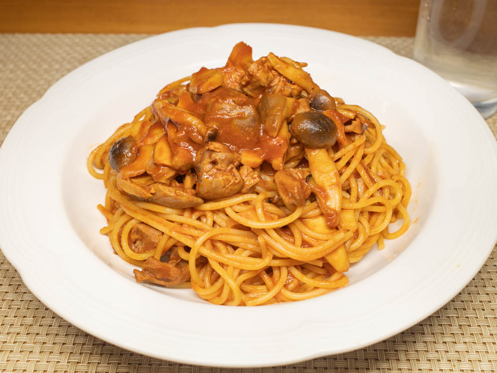鶏もつ(レバー、ハツ)ときのこ(エリンギ、舞茸、ぶなしめじ)を使ったトマトソースのパスタをつくりました。