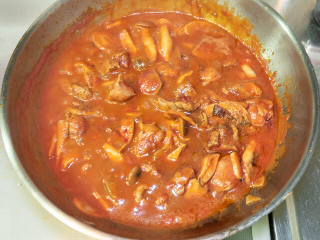 トマトピューレと水、鶏もつ、塩を加えて煮ていきます。