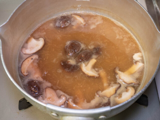 ほうれん草のおひたしと椎茸のお味噌汁をつくります。秋刀魚に塩をふってグリルで焼き、大根おろしを添えたらできあがりです。