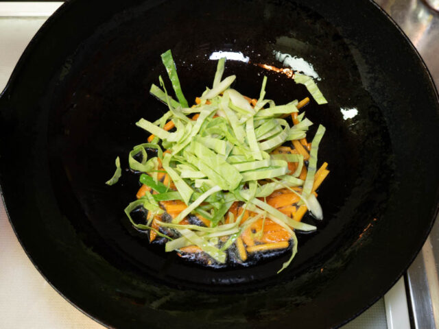 中華鍋にサラダ油を熱して、ニンジンから炒めていきます。