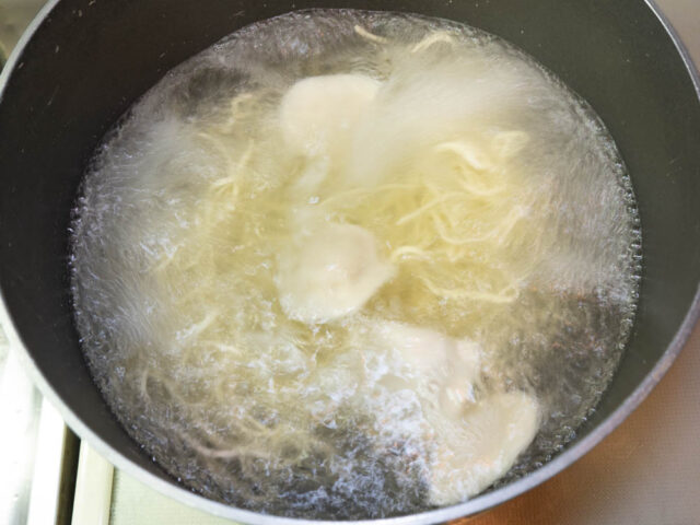 麺と冷凍水餃子を一緒に茹でます。鍋にお湯を沸かし、1分半ほど先に餃子を入れ、あとから麺を入れて、同時に茹で上がるようにします。