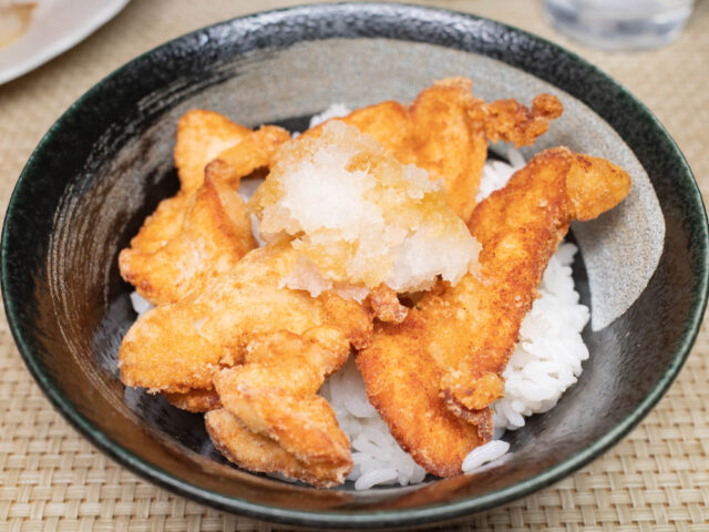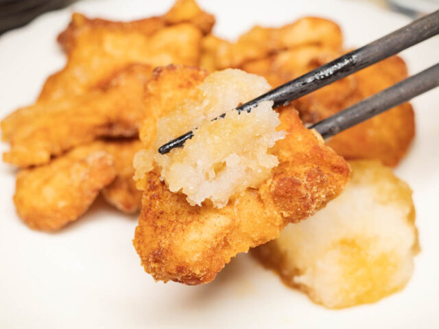 そこに味ぽんの大根おろしをのせれば、揚げ物の香ばしい風味とコクがありながら、まるで油を感じさせない、さっぱりとした竜田揚げの完成です。