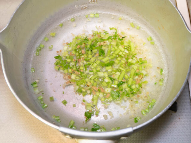 パクチーは葉を摘み取り、茎は細かく刻みます。生姜はみじん切りにします。