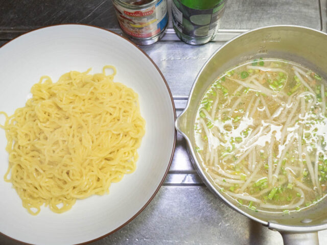 市販の塩ラーメンに、「もやし」と「パクチー」をちょい足ししていただきました。