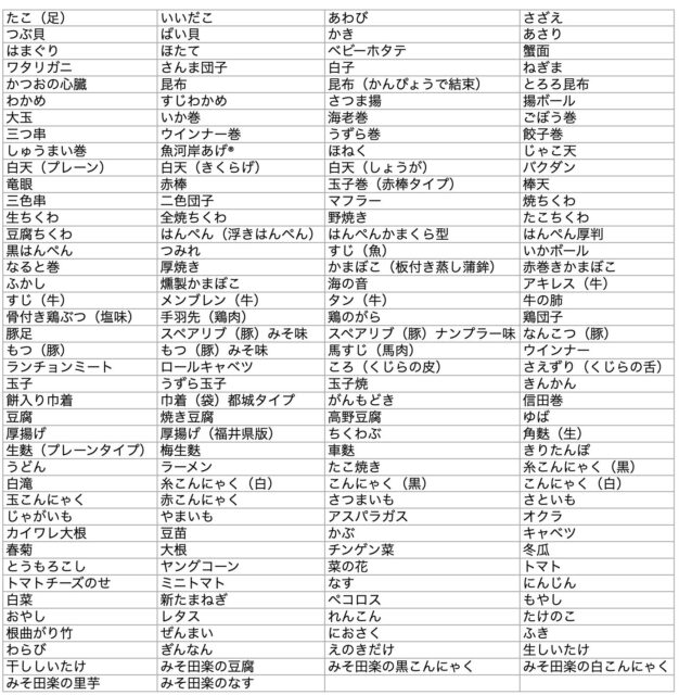 「紀文アカデミー・おでん教室・おでんの具と地域性」では全国のおでん具材162品が紹介されています。