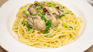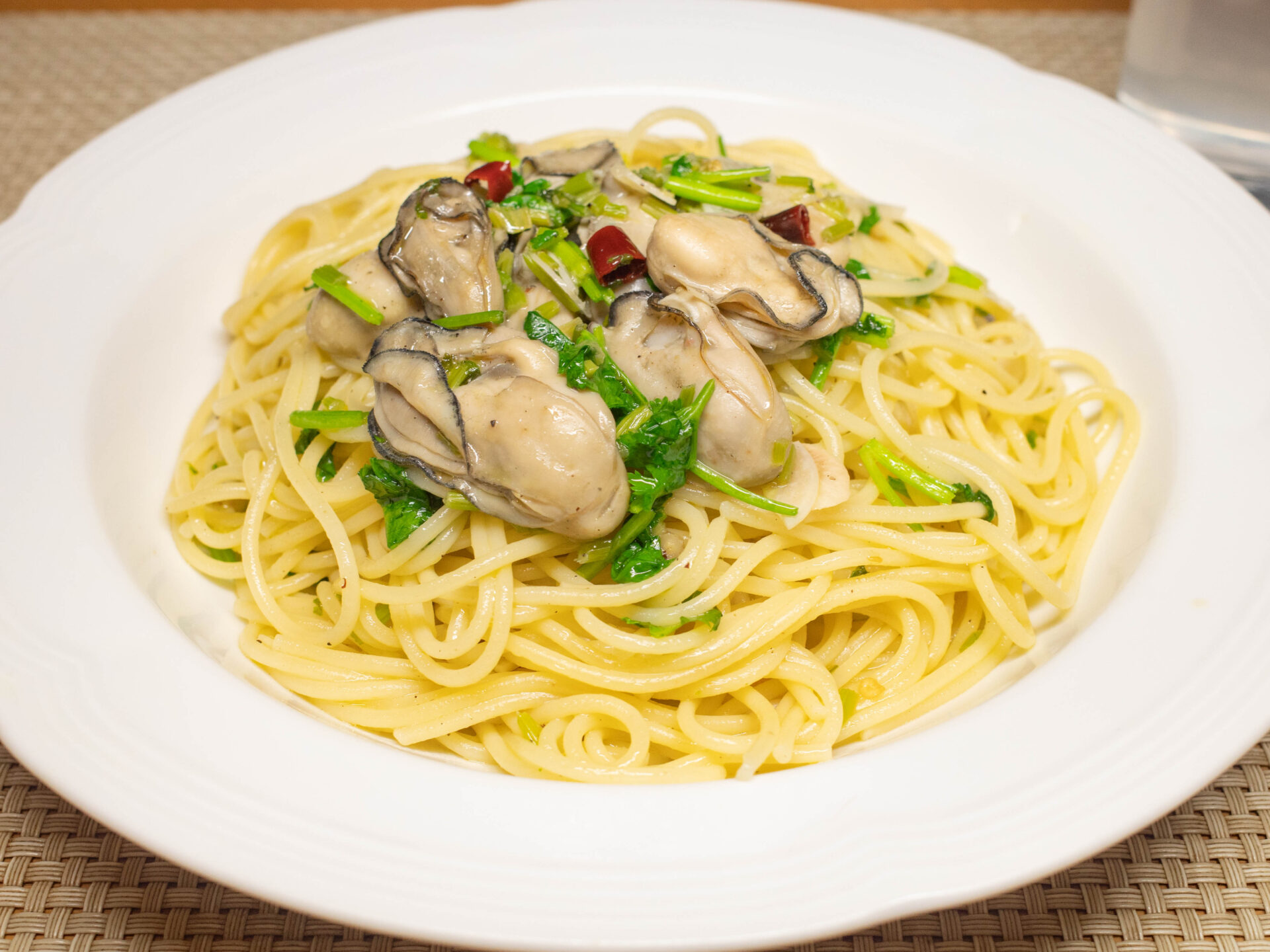 季節の牡蠣とパクチーを使ったオイルパスタをつくりました。