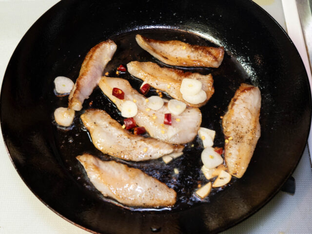 豚トロの両面に軽く焦げ目が付くまで炒めたら、ニンニクと唐辛子を加えます。