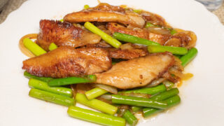 オイスターソースと唐辛子で甘辛く味付けした豚トロは、その脂っこさもあって、ご飯がどんどん進みます。ニンニクの芽の香りと食感もとてもよくあいました。