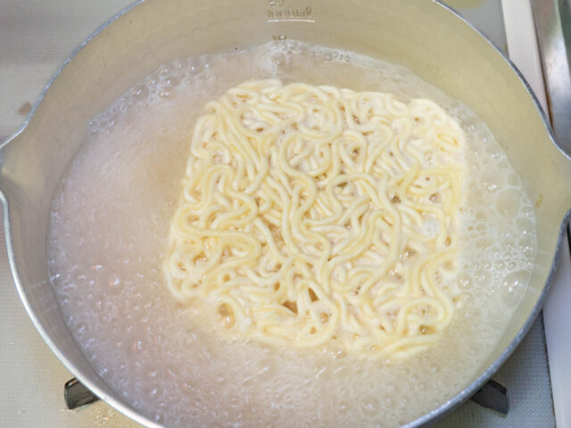 鍋にお湯を沸かし、粉末スープを溶かしてからインスタント麺を加えて茹でていきます。