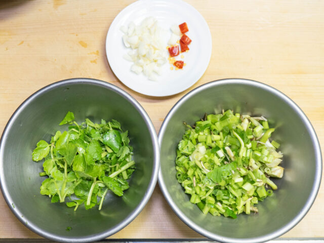 芹は根、茎、葉先、それぞれを刻みます。ニンニクはみじん切りに、唐辛子は輪切りにします。