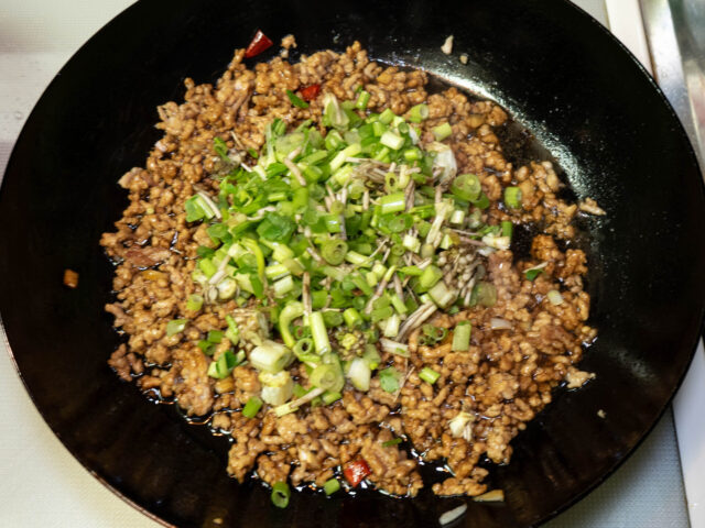 ひき肉から脂が出てきたら、ニンニクと唐辛子を加えます。