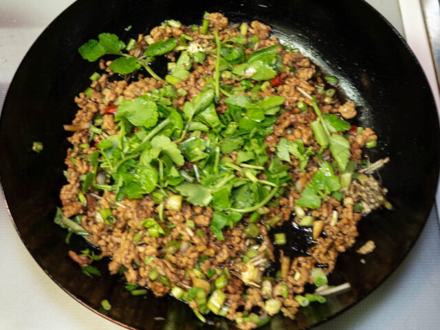 ひき肉の色が完全に変わったら、オイスターソース、ナンプラー、ダークソイソースを加え、胡椒を挽きます。