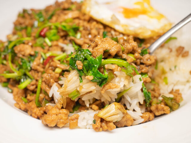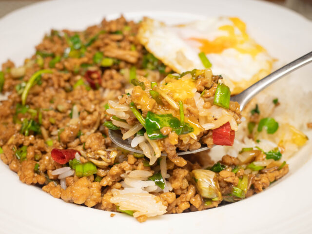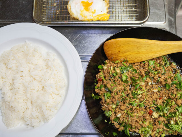 炊いたジャスミンライスをお皿によそい、ひき肉と芹の炒めものをかけ、目玉焼きをのせたらライム果汁を垂らしてできあがりです。