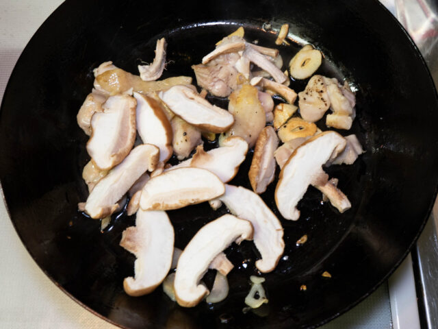 鶏肉の色が変わったら、椎茸を加えて炒めあわせます。