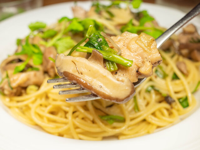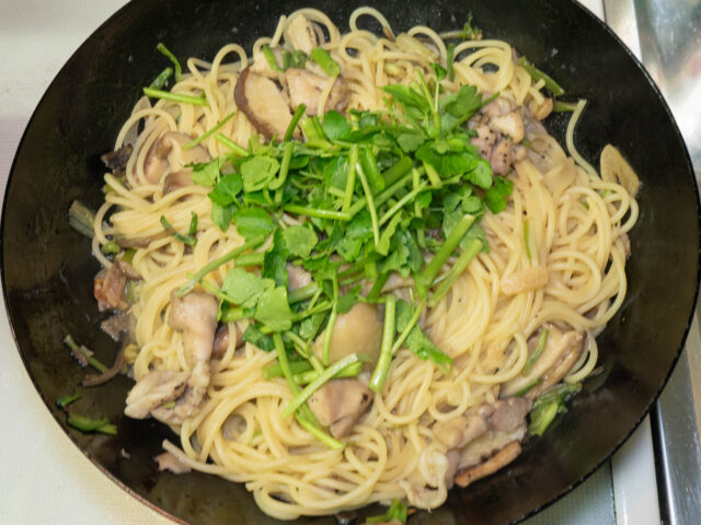 芹と鶏もも肉に椎茸を具材としたパスタをつくりました。