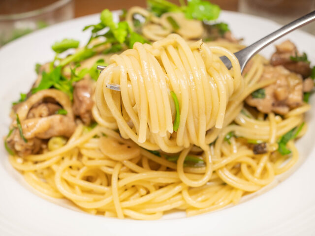 唐辛子を入れないパスタはほとんどつくりませんが、ニンニク+バター醤油の旨みはスゴいですね。日本人なら誰もが大好きな味でしょう。