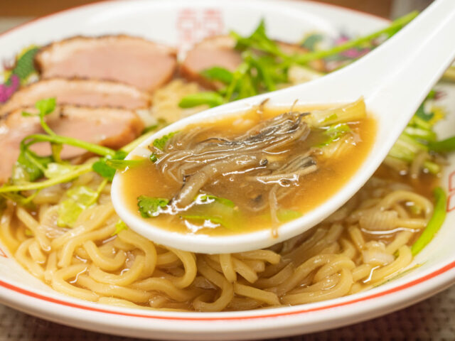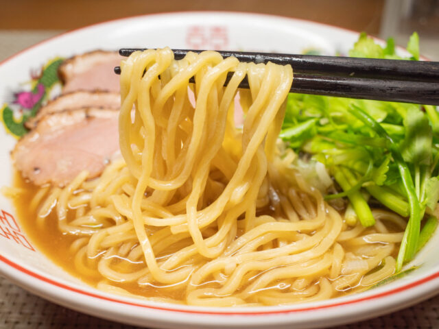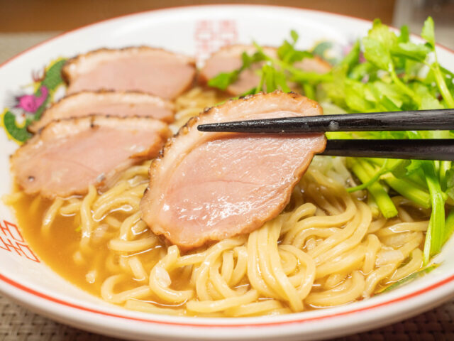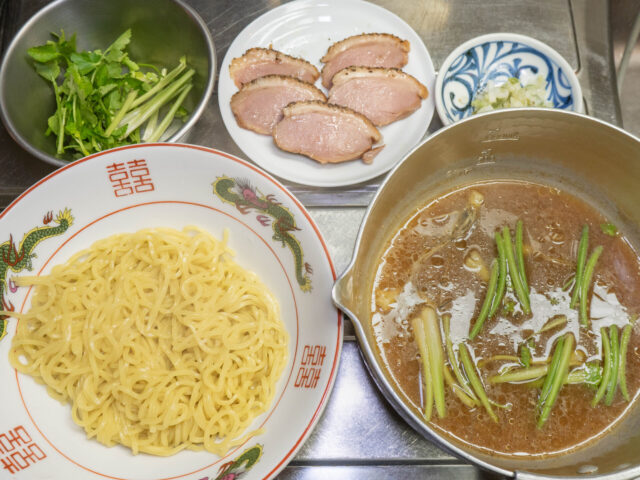湯切りした麺を丼に入れ、直前に芹の茎を加えた味噌スープを注ぎます。レンジに10秒ほどかけて表面の脂を溶かした鴨の切り身と、芹の葉先をのせてできあがりです。