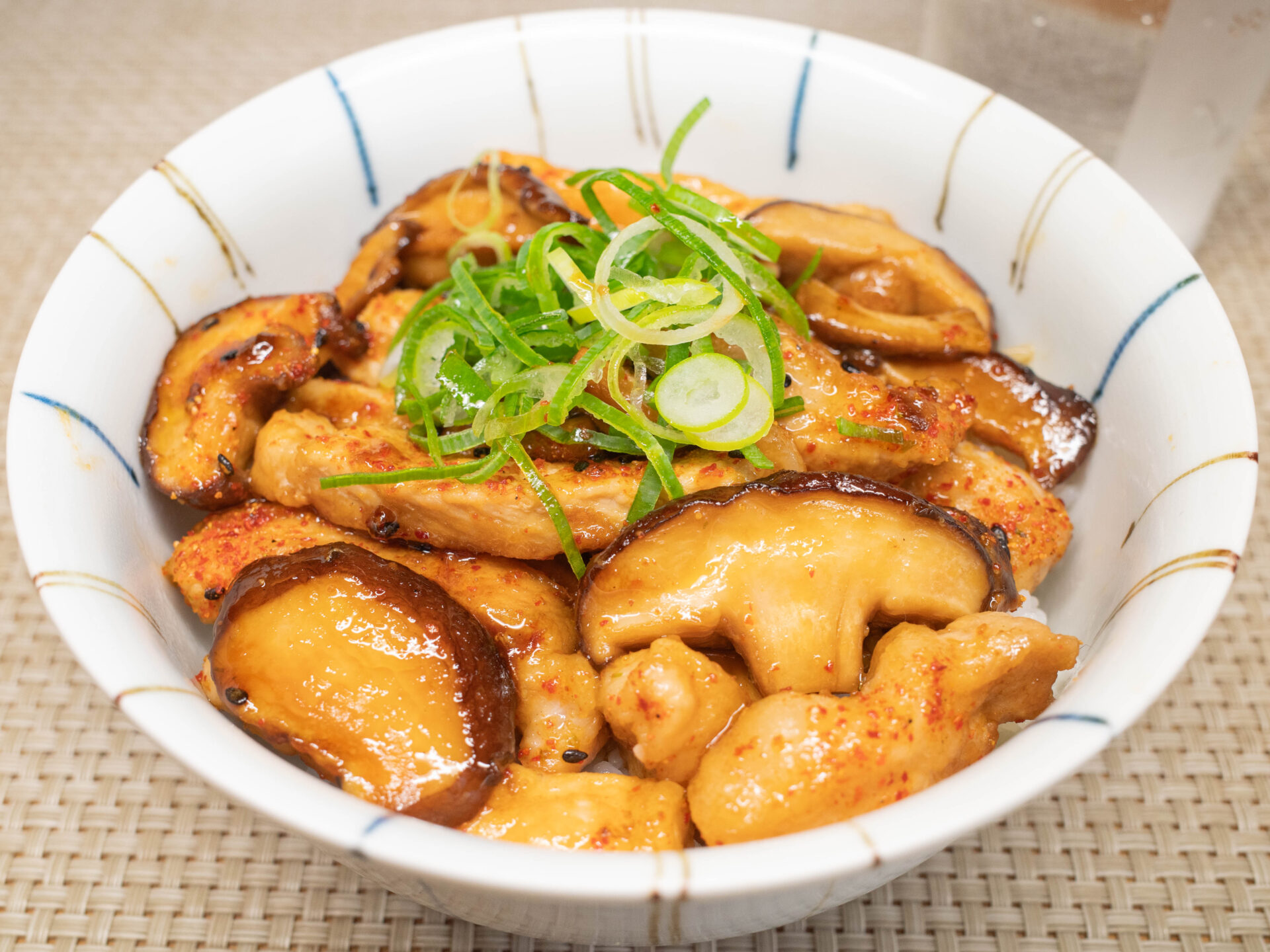 「豚ロースと椎茸」を「鶏もも肉と長ねぎ」に替えれば焼き鳥丼です。