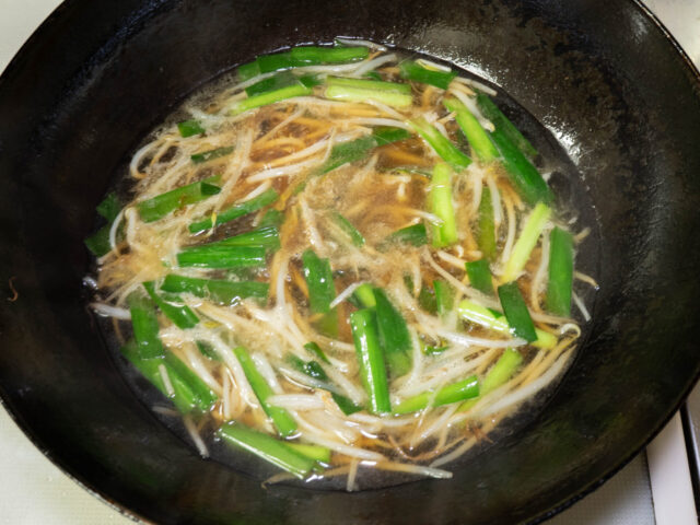 ニラも強火で手早く炒めて良い香りが立ったら、水とラーメンの液体スープを加えます。