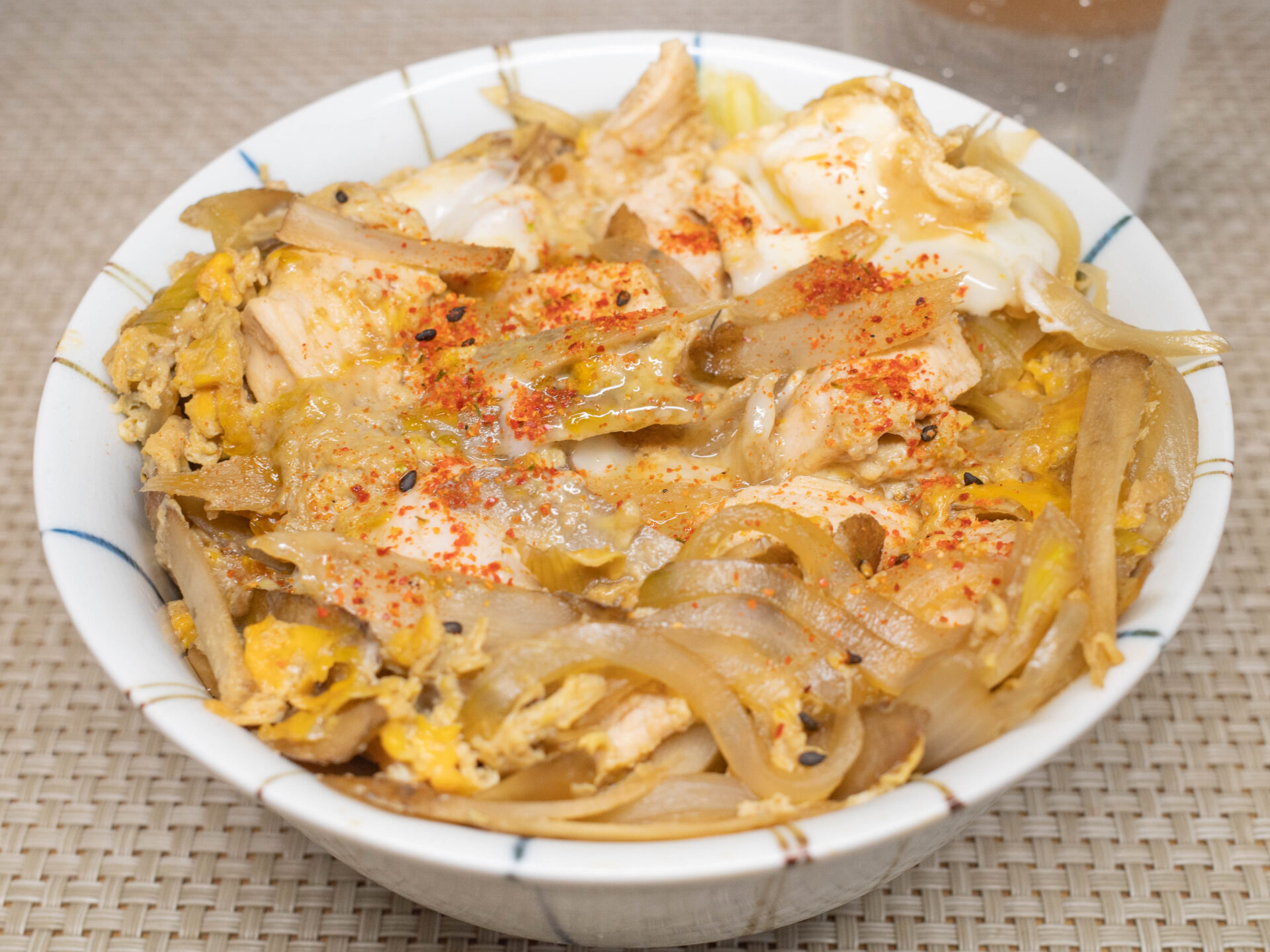 卵が固まったら火を落とします。丼によそったご飯にかけ、七味唐辛子をふってできあがりです。