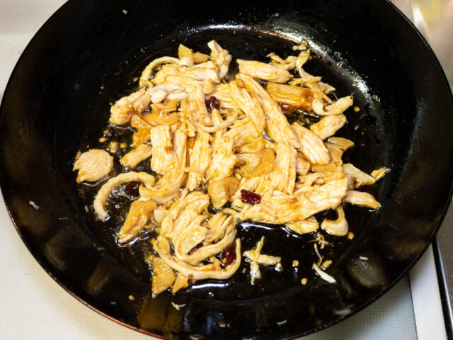 ニンニクの香りが立ったら、ほぐした茹で鶏を加えます。