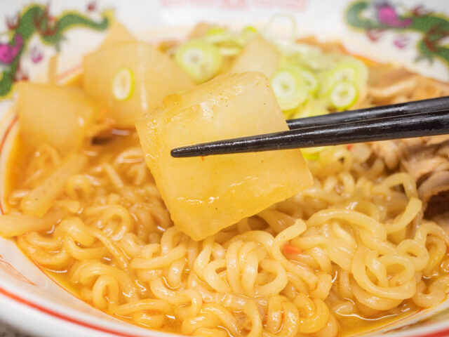 ほどよく煮えた大ぶりの大根は、旨辛スープとの対比で味と甘さが際立ち、辛ラーメンにのせても豚肉に負けない存在感があります。