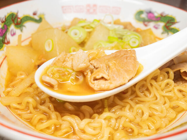 辛ラーメンのパンチのある唐辛子の辛さは舌に残りますが、大根はそれを受け止め、少しだけ丸くしてくれる存在です。豚こま肉の脂とも競り合うことなく、むしろ脂を洗うように後味を整える。麺をすすり、肉を頬張り、そして大根をかじる。その循環が、この一杯のリズムになっています。