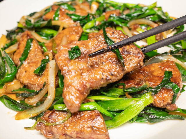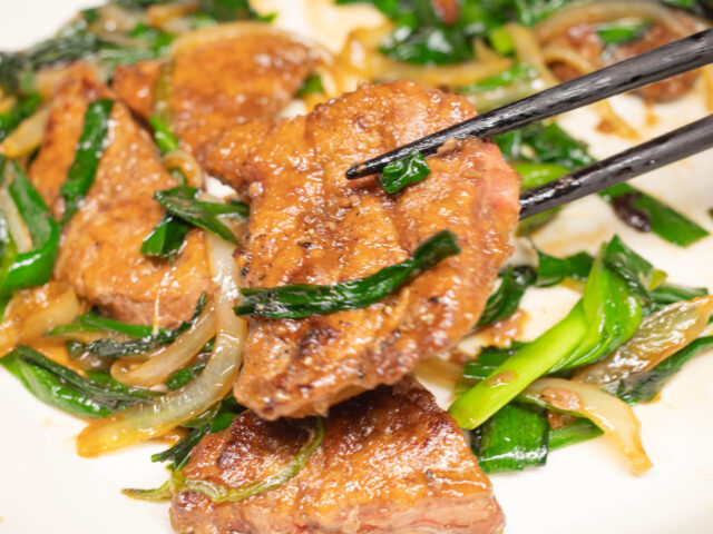 片栗粉をまぶして焼き目をつけたことで香ばしさが加わったレバー、香りのニラと甘みの玉ねぎ、それらにオイスターソースと醤油の甘辛ダレが絡むというレバニラ炒めの王道は外していません。