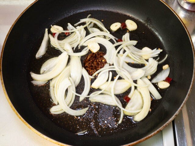 ニンニクの香りが立ったら、玉ねぎを加えて炒めます。