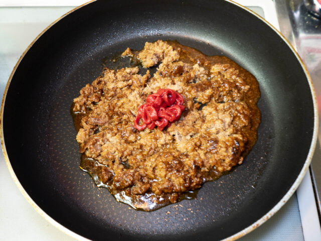 唐辛子の香りが立ったら、ウィンナーを加えて炒めていきます。