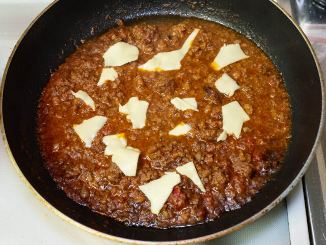 キャベツがしんなりしてくるまで炒めたら、胡椒を挽き、パスタの茹で汁を加えてソースの完成です。