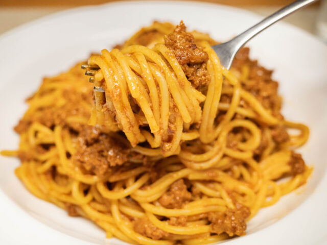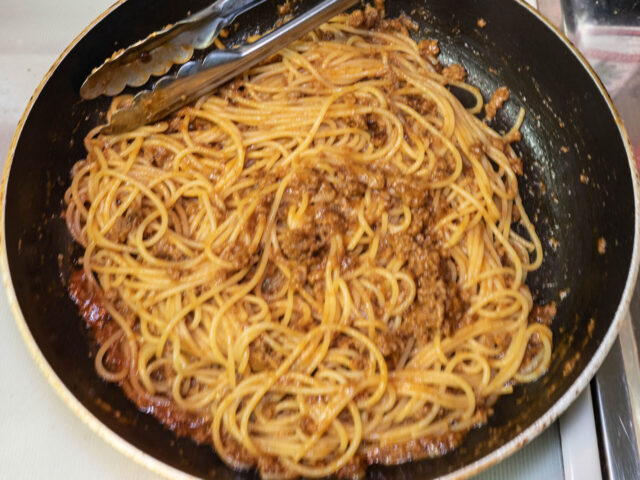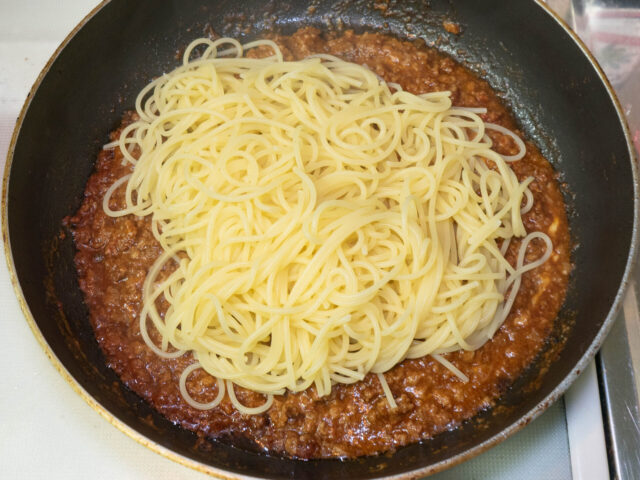 茹で上がったパスタをソースのフライパンにあわせ、よく混ぜたらお皿に移してできあがりです。