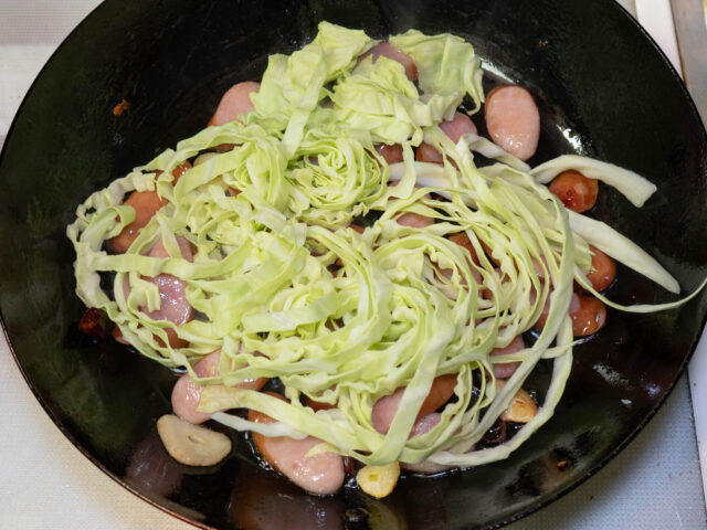 ウィンナーを3分ほどかけて炒めたら、キャベツを加えます。