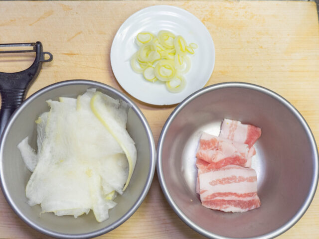 大根はピーラーで縦に薄切りにします。長ねぎは小口切りに、豚バラ肉は一口大に切り分けます。