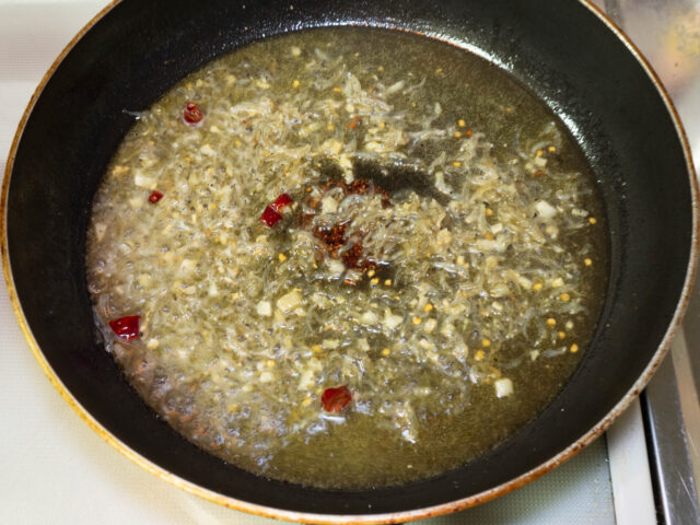 ちりめんじゃこをじっくりと炒めることで、強い旨みと香ばしい風味がオイルにうつります。