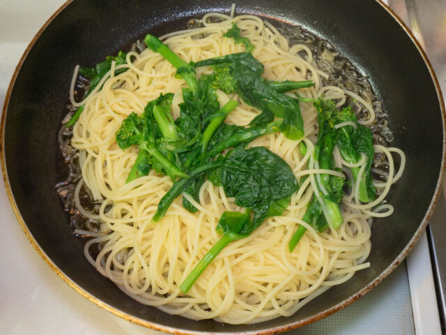 パスタの茹で上がり2分前に菜の花も加えて、一緒に茹でていきます。