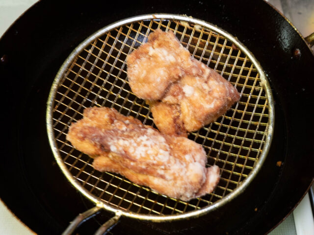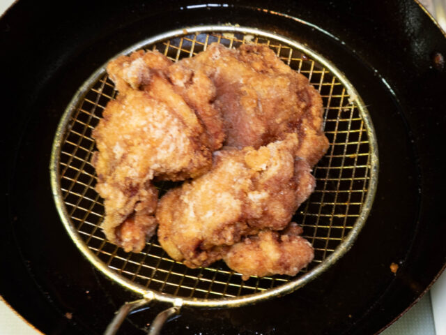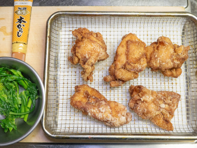 衣の香ばしさと生姜と醤油の風味に、鶏もも肉のジューシーな旨みが重なり、お箸が止まりません。