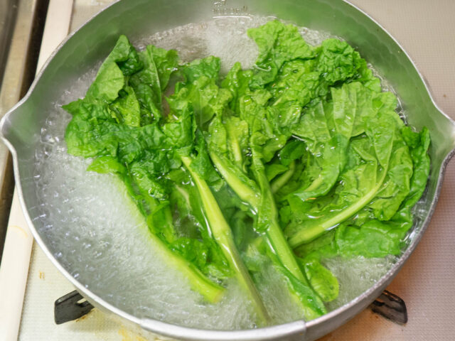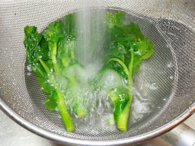菜の花は下茹でします。鍋にお湯を沸かして菜の花を入れ、2分ほど茹でたら冷水にとって冷まします。