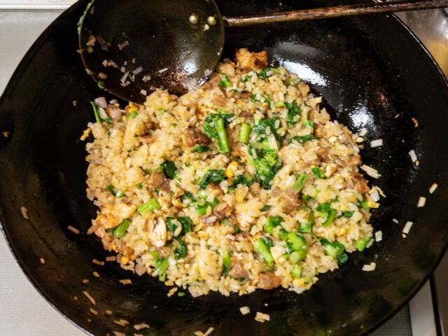 ご飯がよく炒められたら、取り出しておいた豚バラ肉、刻んだ菜の花と長ねぎをあわせます。