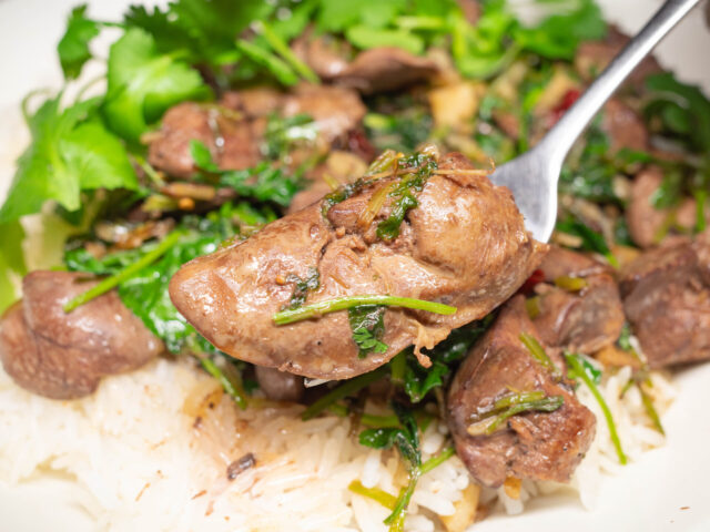 鶏のハツは切り開き、レバーは食べやすい大きさに切ります。血の塊を取り除き、ボウルに溜めた水にしばらくさらしてから水気を取ります。パクチーの根と茎は刻み、葉の部分はざく切りにします。ニンニクは粗みじん切りに、唐辛子は輪切りにします。