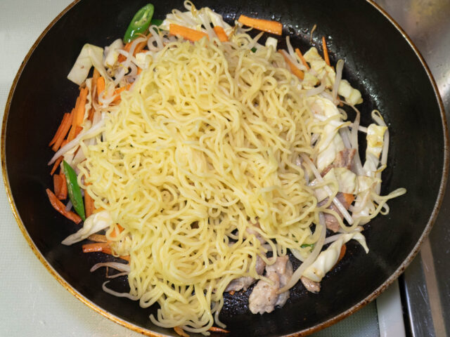 さらに1分炒めたら、焼きそば麺と少量の水を加え、ほぐしながら炒め合わせます。