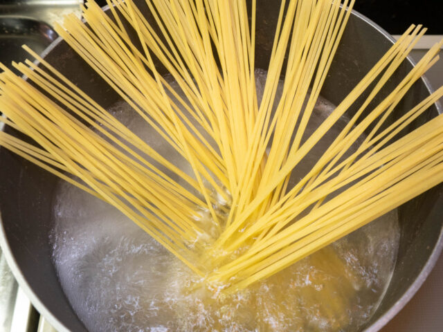 ソースをつくるのと同時進行で、鍋にお湯を沸かし、塩を適量溶かしてからパスタを茹でていきます。