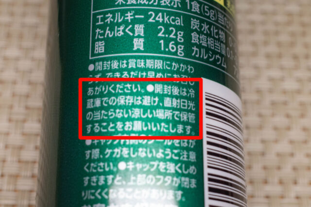 「 開封後は冷蔵庫での保存は避け、直射日光の当たらない涼しい場所で保管することをお願い致します。 」