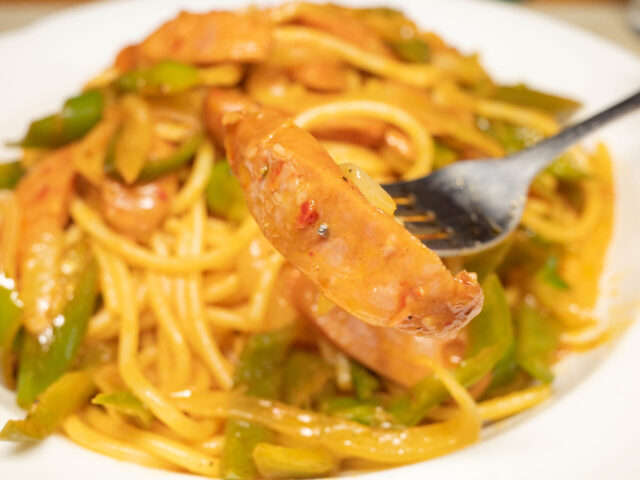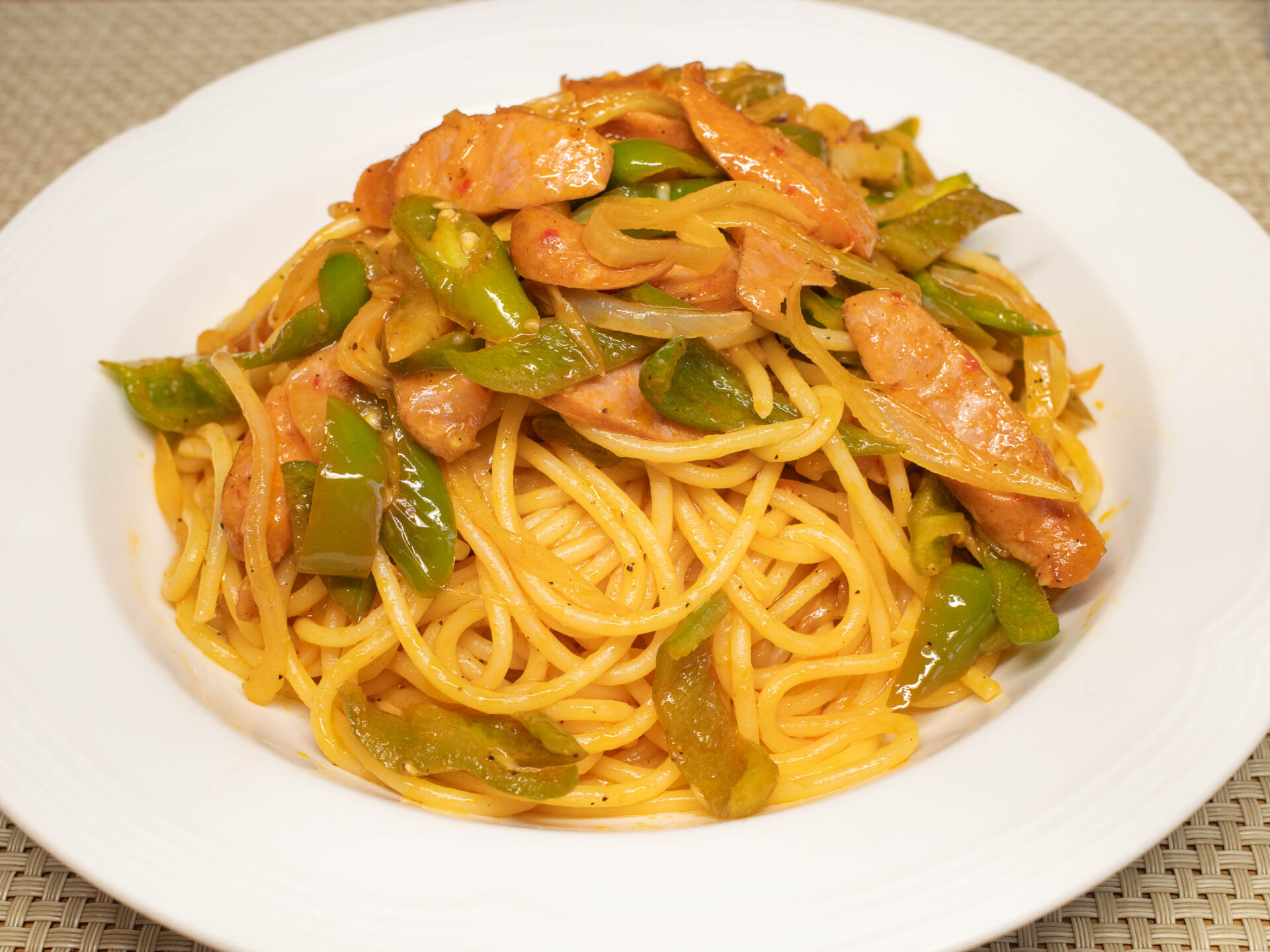 このピリ辛ソーセージと青唐辛子で、ホットなナポリタンをつくりました。