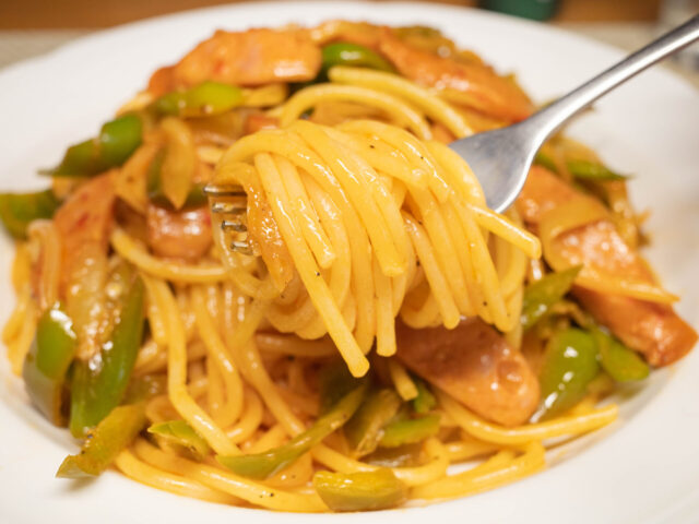 私の中では、ナポリタンも基本的なオイルパスタの延長なので、いつもは唐辛子とニンニクを使っています。それをピリ辛ソーセージと青唐辛子に入れ替えたわけですが、旨辛にまとまっておいしいナポリタンになりました。